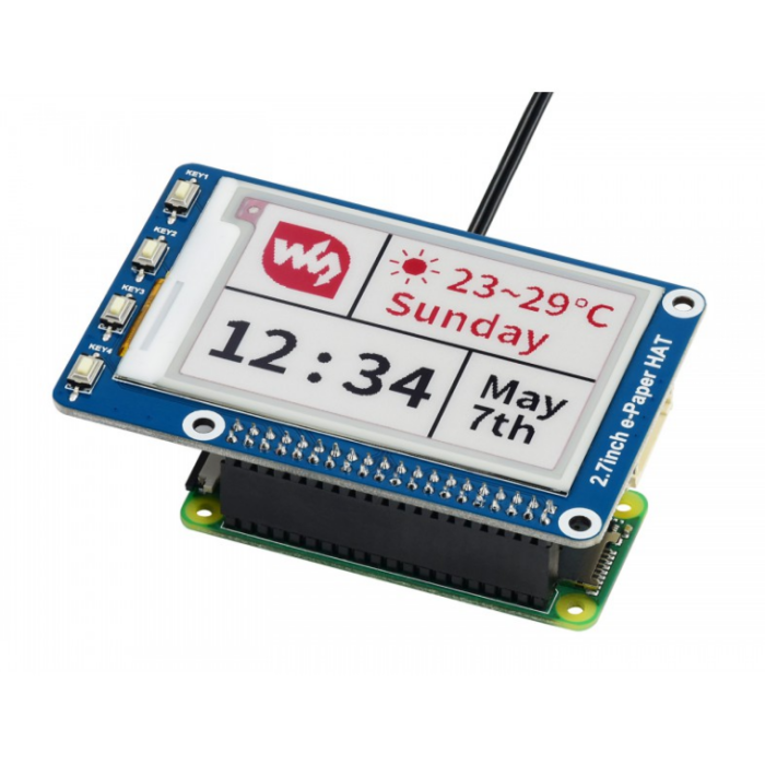 | Korte Beschrijving | E-Ink-display HAT voor Raspberry Pi, 2,7 inch, 264x176 resolutie, met ingebouwde controller, verbind via SPI-interface, ondersteunt rood, zwart en wit drie kleurend isplay. |