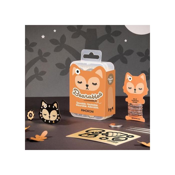Een complete Bearables Fox-set met gekleurde LED-badge, lichtsensor, draad, naalden en batterij. Naaibaar, hackbaar, draagbaar, schattig!