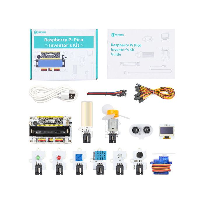 | Korte Beschrijving | De Wukong2040 Inventor's Raspberry Pi Kit is een kit die is ontwikkeld voor uitvinders die leren elektronica te programmeren. Het bevat een multifunctioneel breakout-board, de Wukong2040, ontworpen voor de Raspberry Pi Pico, en 11 verschillende soorten sensoren en actuatoren om een breed scala aan interessante en praktische projecten te creëren. De Wukong2040 Inventor's Kit ondersteunt MicroBlocks grafische programmering, waardoor beginners zonder ervaring in elektronicaprogrammering zo snel mogelijk aan de slag kunnen en leren programmeren. Het Wukong2040 uitbreidingsbord, ontwikkeld door het team van ELECFREAKS, heeft een modulair ontwerp met krachtige onboard functionaliteit voor ervaren makers om de CircuitPython codeprogrammeerstijl dieper te verkennen en snel projecten te creëren. Functie |