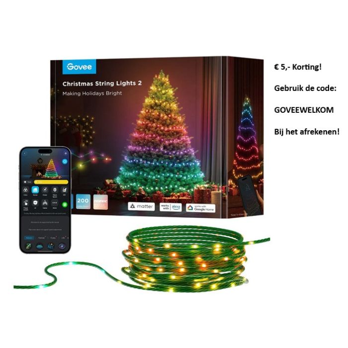 | Korte Beschrijving | Verlicht uw kerstboom, huis of buitenruimte op een feestelijke manier voor de feestdagen met deze slimme Govee Christmas String Lights. Deze handige lampjes kunt u bedienen met de Govee Home app (Android & iOS). In de app kunt u kiezen uit verschillende RGBW-kleuren en bovendien kunt u ieder individueel lampje voorzien van een unieke kleur. Zo creëert u gepersonaliseerde lichteffecten die zelfs kunnen synchroniseren met muziek. Daarnaast heeft u in de app keuze uit meer dan 100 lichtmodi. De unieke AIGC-functie maakt deze verlichting nog slimmer. Zo kunt u de lampjes, met behulp van AI, ook besturen met uw stem, berichtjes in de app en afbeeldingen. De 200 led lampjes zitten aan een groen draad die 20 meter lang is. In de doos zitten de verlichting, adapter (2,5 meter lang) en handleidingen. |