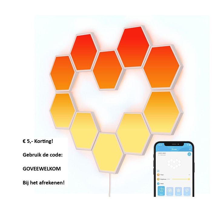 | Korte Beschrijving | De Govee Glide Hexa Light Panels transformeren uw interieur met hun veelzijdige en aanpasbare verlichting. Deze 36 W lichtpanelen zijn ontworpen om moeiteloos een unieke sfeer te creëren in elke ruimte. Met 10 panelen kunt u eindeloos combineren en ontwerpen. Met de slimme Govee Home-app-bediening (iOS & Android) kunt u de kleuren en effecten van de panelen beheren en wijzigen. Kies uit miljoenen RGB-kleuren of wittinten en verschillende verlichtingsmodi om altijd de juiste sfeer te creëren, of het nu voor een feest, ontspanning of werk is. Ook kunt u deze panelen bedienen via Amazon Alexa en Google Assistant. De geïntegreerde muziekmodus synchroniseert de verlichting met uw favoriete muziek. De installatie is eenvoudig dankzij de bijgeleverde montagematerialen. Bovendien zijn de panelen energiezuinig, wat betekent dat u kunt genieten van deze verlichting zonder een hoge energierekening. Daarnaast hebben deze panelen een levensduur tot 50.000 branduren, waardoor u jarenlang plezier heeft. |