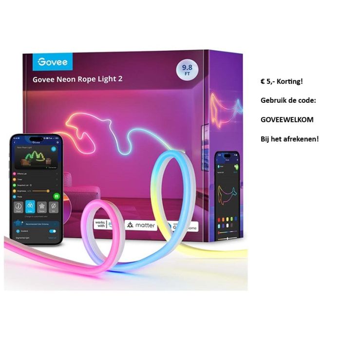 U kunt de lichtslang naar wens buigen en vormen, waardoor u creatieve en unieke lichtontwerpen kunt maken. Bovendien is de Govee lichtslang compatibel met spraakbesturing via Amazon Alexa en Google Assistant, waardoor u de verlichting handsfree kunt bedienen. Bovendien is het ook compatibel met Matter en Samsung SmartThings. Zo integreert u deze lichtslang eenvoudig met andere smart home systemen en apparaten.