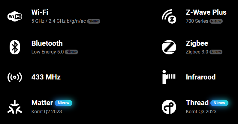 | Protocol | Z-Wave, Z-Wave Plus, Zigbee, Bluetooth, HomeKit, WiFi, Infrarood, 433MHz |