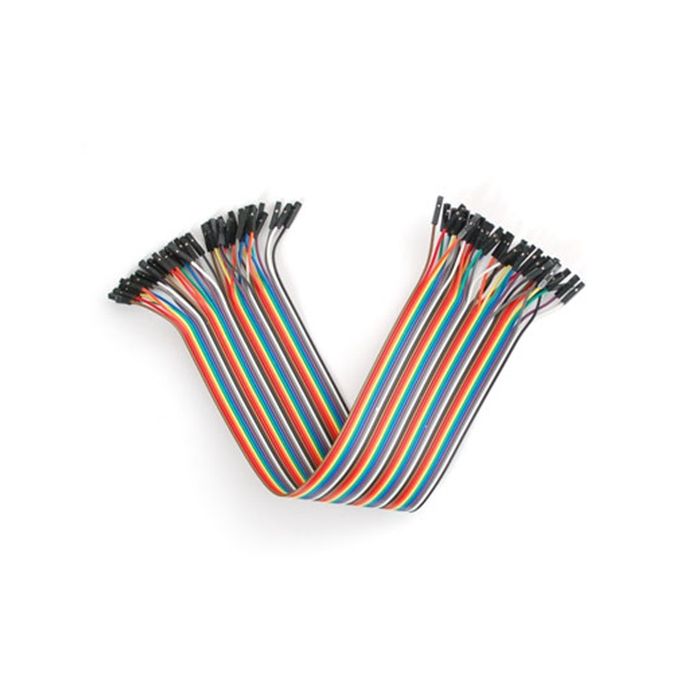 Ideaal voor het verbinden tussen headers op printplaten. Deze draden zijn 300 mm lang en worden geleverd in een 'strip' van 40 (4 stuks van elk van de tien regenboogkleuren). Ze hebben aan beide uiteinden vrouwelijke headercontacten van 0,1 inch en passen standaard netjes naast elkaar. -pitch 0,1" (2,54 mm) header.