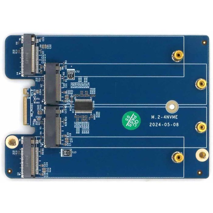 De M.2 4×1 kaart biedt in plaats daarvan vier M.2 PCIe Gen 3 x1 lanes-connectoren. Hiermee kun je vier M.2-apparaten gebruiken: elke combinatie van NVMe-schijven, netwerkadapters, wifi-adapters, 5G-adapters, enz., die gebruikmaken van de bandbreedte van PCIe Gen 3 x1 lane.