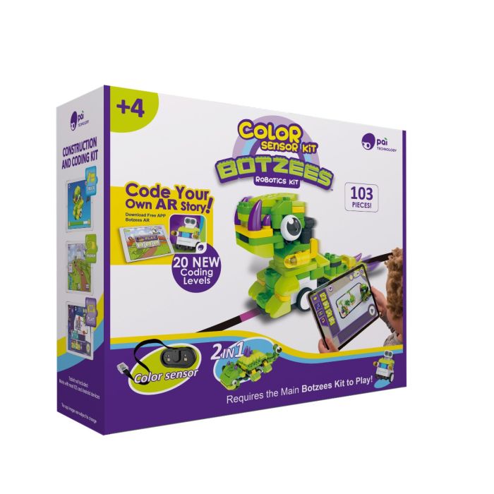 Pai Botzees Kleurensensor set is een uiutbreidingsset dat wordt geleverd met een kleurensensor. Met de Pai Botzees Kleurensensor set kunnen kinderen robotdinosaurussen bouwen en ze vervolgens programmeren om de lijn op de vooraf ontworpen kaart te volgen, onderweg verschillende kleuren te herkennen en dienovereenkomstig te reageren. Om nog meer plezier toe te voegen, kunnen kinderen ook bouwen met behulp van de blokken, het hoofdbesturingsblok en de sensor uit de originele Botzees-set om meer manieren om te spelen te ontdekken!