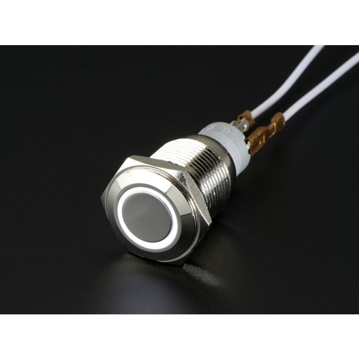 Aan de voorkant van de knop bevindt zich een platte metalen actuator, omgeven door een witte plastic LED-ring. Aan de achterkant bevinden zich 3 contacten voor de knop (gemeenschappelijk, normaal open en normaal gesloten) en 2 voor de witte LED-ring (+ en -). Sluit 3 tot 6V aan op de LED om deze te hebben licht mooi op, er is een ingebouwde weerstand! Als je deze met een hogere spanning wilt gebruiken, bijvoorbeeld 12V of 24V, voeg dan gewoon een weerstand van 470 ohm toe in serie met de LED-aansluiting om de LED-stroom rond de 20mA te houden.
