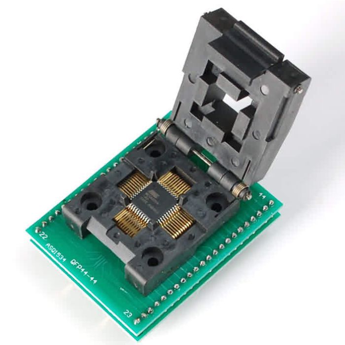 Ken je die ZIF-sockets die we hebben voor DIP-chips? Nou, deze zijn precies zo, maar dan voor SMT-onderdelen! Ja, dat klopt, nu kun je je favoriete nieuwe onderdelen programmeren en testen in TQFP-48-pakketten met fijne toonhoogte. Deze testaansluiting is geschikt voor elke QFP-48 met een vierkante behuizing van 7 mm. Open gewoon de vergrendeling, plaats de chip er voorzichtig in en sluit de bovenkant eroverheen. De chip wordt stevig tegen gouden 'vingers' in de socket gehouden. De socket is op een paar PCB's gesoldeerd, waardoor er in wezen een 48-pins DIP met een tussenruimte van 0,6 inch ontstaat die vrij gemakkelijk op een breadboard kan worden geplaatst.