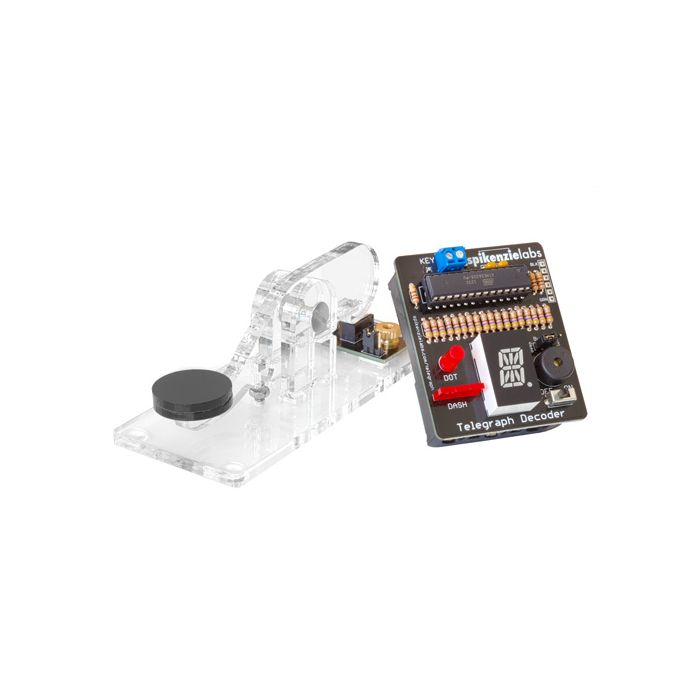 De SpikenzieLabs Telegraph Decoder Kit is een tweedelige kit die een op Arduino gebaseerde Morse Code-decoder maakt met een groot LED-display met 16 segmenten om de letters en cijfers van de decoder weer te geven. De kit bevat ook een elegante telegraafsleutel gemaakt van lasergesneden acryl maar met "antieke" styling.