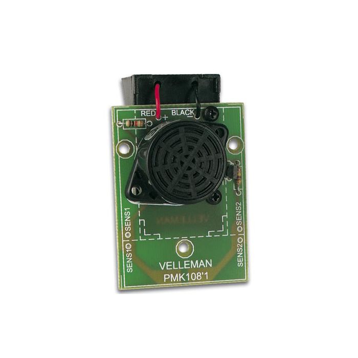 | Korte Beschrijving | Een alarmsignaal weerklinkt wanneer er water wordt gedetecteerd. Ingebouwde alarmbuzzer. Watersensor kan op afstand worden geplaatst : het sensorgedeelte kan worden afgezaagd en doorverbonden via kabels. Voeding: 9V batterij (niet meegelev.). Afmetingen: 45 x 70mm. |