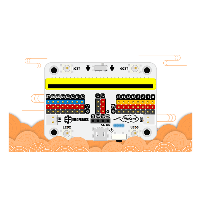 Wukong is een hoog geïntegreerd breakout-bord met meerdere functies op basis van micro: bit, dat een vergelijkbare grootte heeft als de micro: bit met zoemer, servo- en motoraandrijvingen aan boord. De basisbordontwerpen met standaard 7x5 vierkante stenen die perfect kunnen worden aangepast aan Lego.